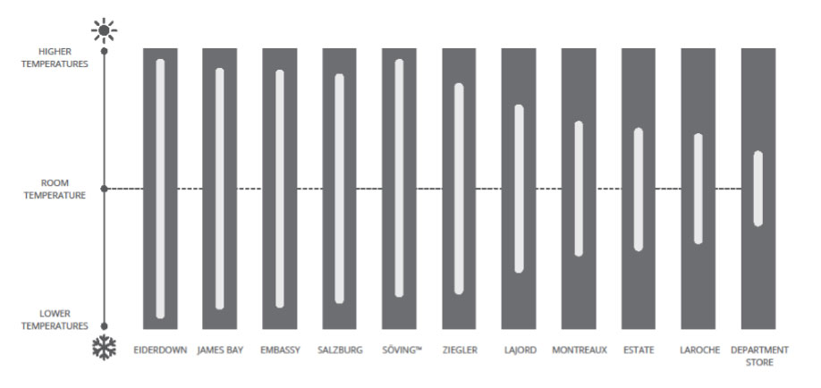 Higher quality duvets are more versatile: they will be warmer in the winter and cooler in the summer than lower quality duvets. This is because higher quality down is better at insulation, lightness, and breathability than lower quality down. The table below illustrates how this works.