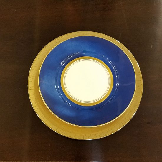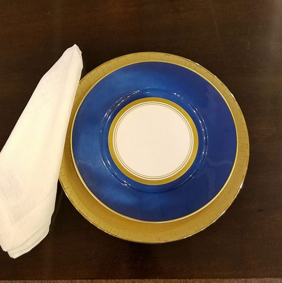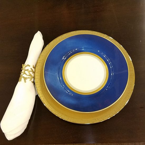 Add a marine blue dinner plate. Notice how the gold detailing along the center rim picks up the glow from the charger.